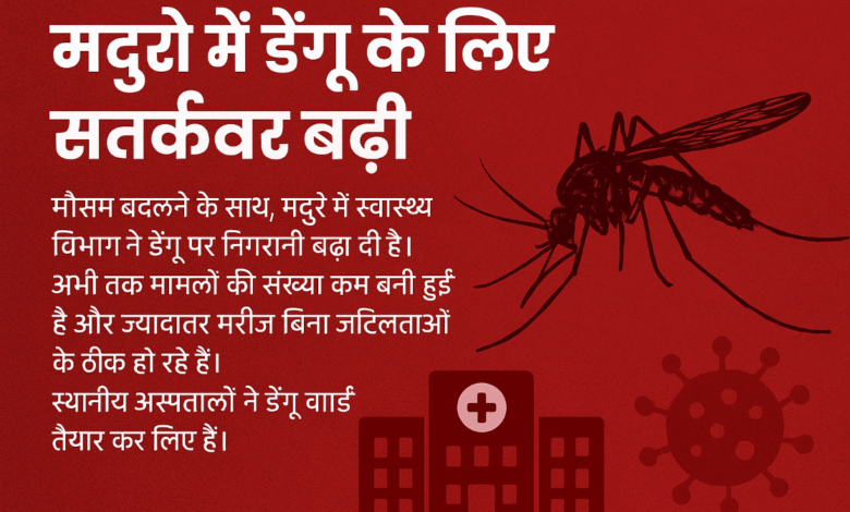 मौसम में बदलाव के साथ ही तमिलनाडु के मदुरै में डेंगू को लेकर सतर्कता बढ़ा दी गई है। स्वास्थ्य विभाग ने शहरभर में निगरानी तेज कर दी है और स्थानीय अस्पतालों में डेंगू वार्ड तैयार किए गए हैं।